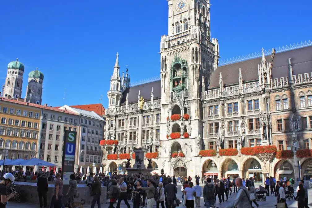 Münchens zentraler Platz mit dem Neuen Rathaus und dem Glockenspiel