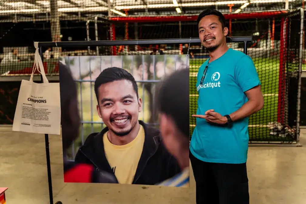 Der Eindruck täuschte nicht: Hier sieht man doppelt! Zahlreiche Protagonist*innen der Ausstellung waren als Ehrengäste bei der Vernissage anwesend – viele von ihnen haben sich durch die Initiative buntkicktgut und über die verbindende Kraft des Fußballs und von Menschen wie buntkicktgut-Gründer Rüdiger „Papa Rudi“ Heid auf die denkbar schönste Weise integriert, Strukturen gefunden und neue Freundschaften geknüpft.