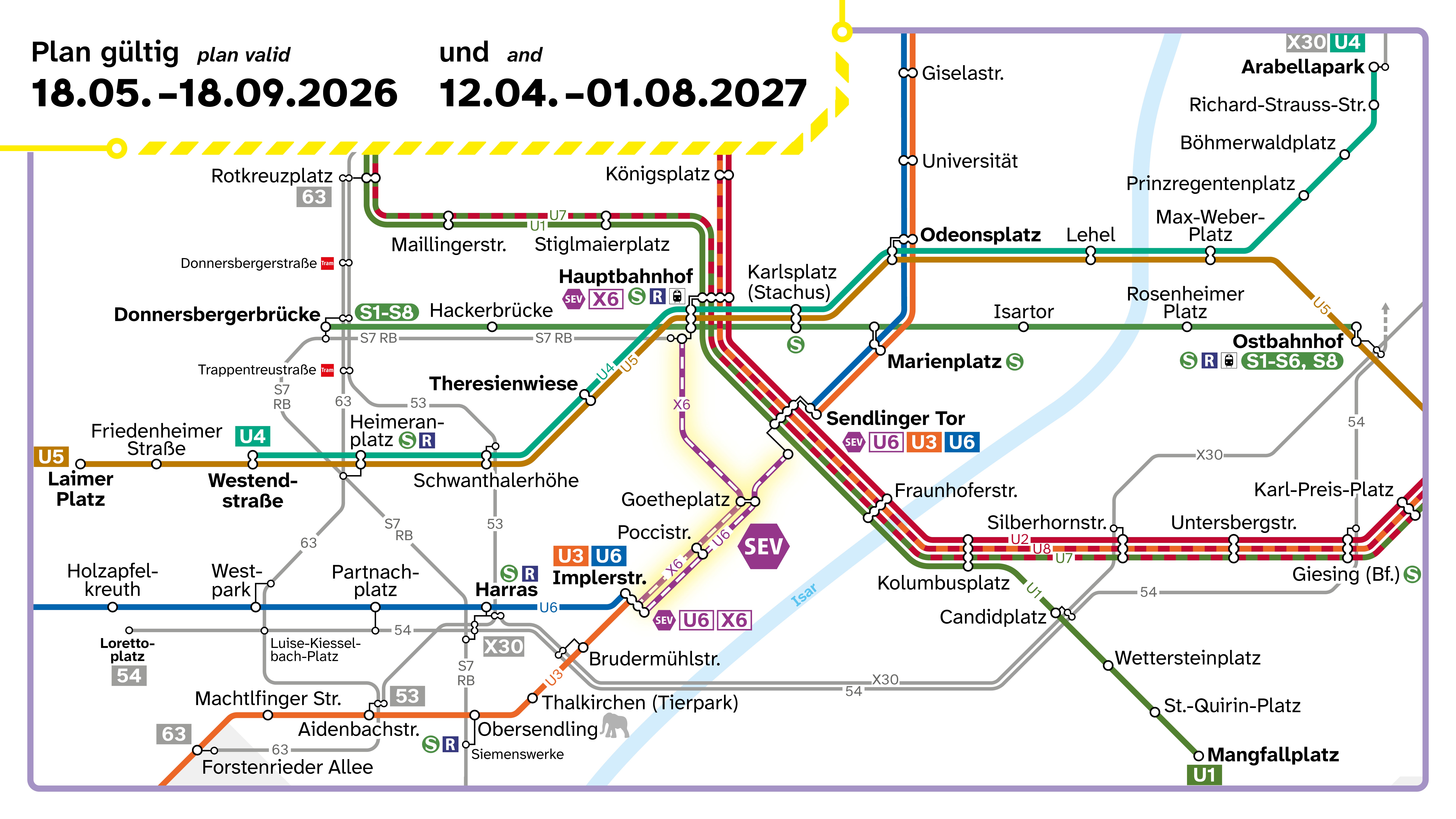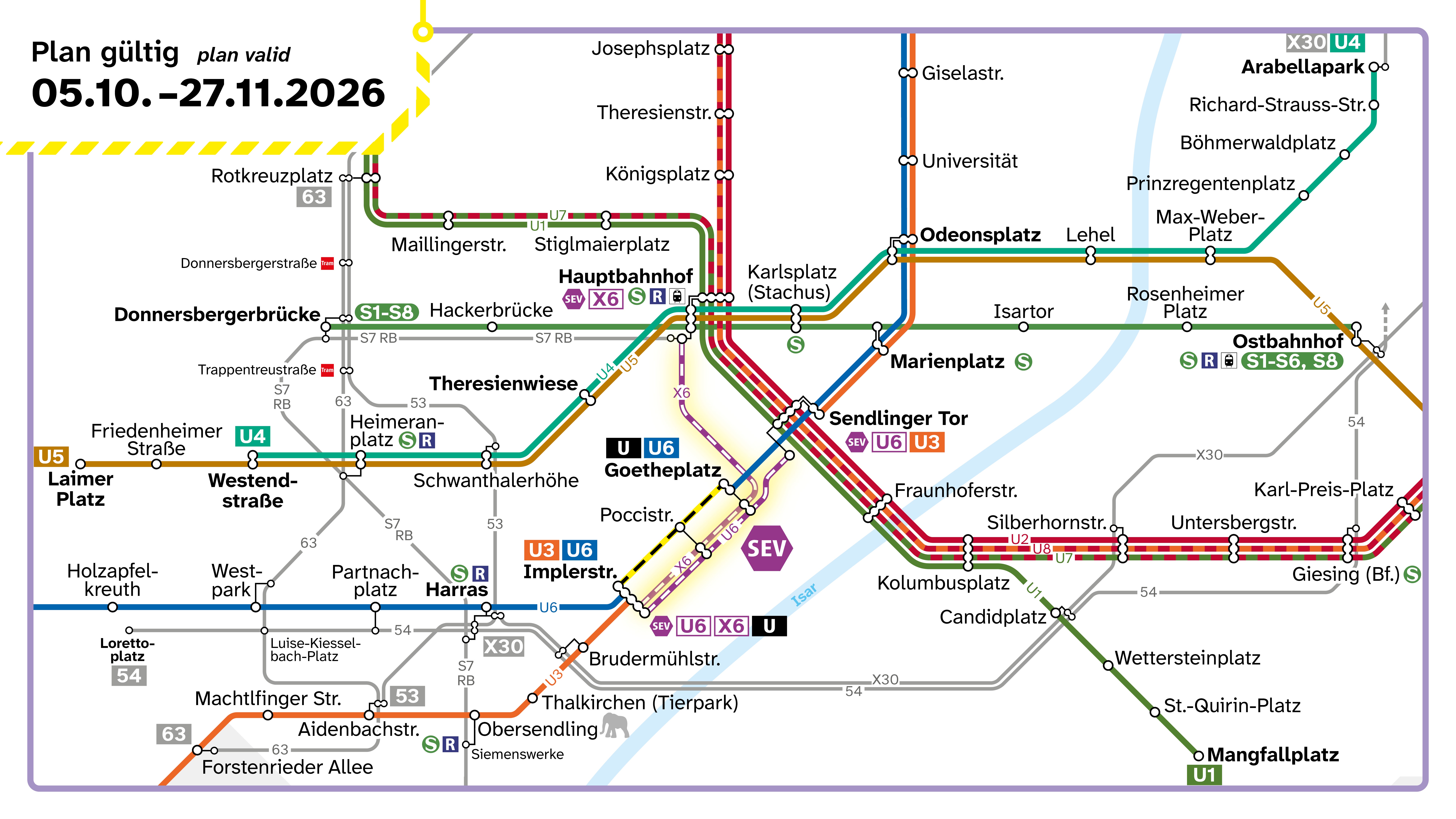 - Ersatzbus X6 bindet zusätzlich den Hauptbahnhof an und fährt im Abschnitt Implerstraße – Poccistraße – Goetheplatz – Hauptbahnhof Süd